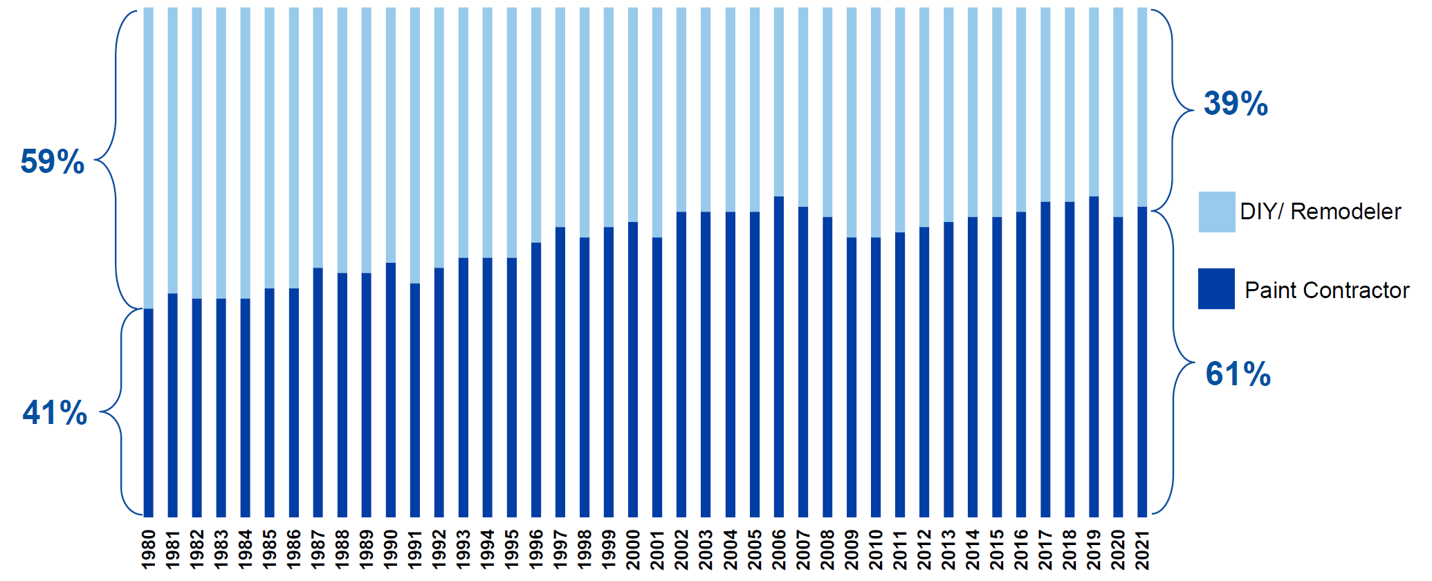 The demand breakdown should elucidate why it is of paramount importance to sell through third party retailers which enjoy massive foot traffic from DIY customers. While DIY segment saw a resurgence post-Covid due to shortage of labor as well as increased interest by DIY customers, it is the Pro segment that increased overall market share from 41% in 1980 to 61% in 2021. Therefore, it is entirely possible that over the next 20-30 years, DIY segment will continue to lose share to Pro segment. This is likely to be good news for Sherwin Williams as Pros tend to go directly to their stores for their painting needs.