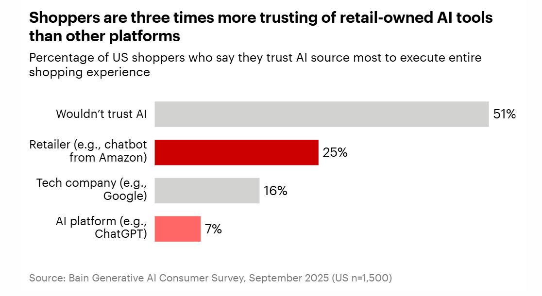 What I found quite interesting from this piece by Bain & Company is nearly half of the customers seem hesitant to trust AI for their shopping. Even more interestingly, customers seem to trust retailers’ on-site agents 3x more than third-party agents such as ChatGPT.