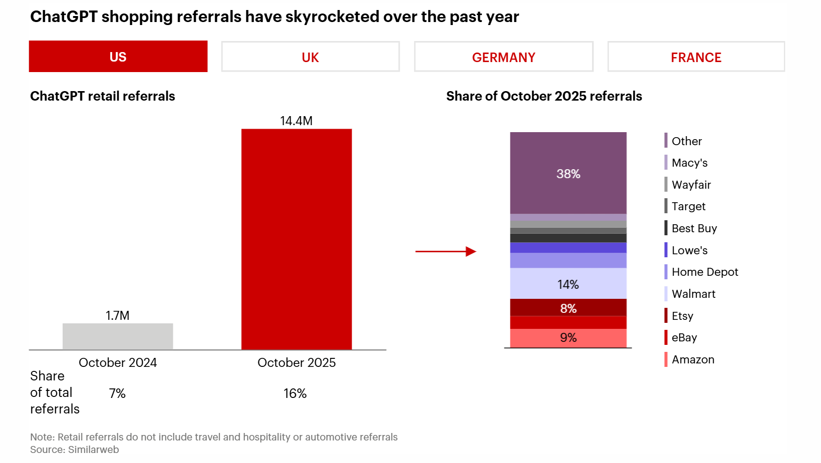 Given this context, it should be no surprise that shopping on ChatGPT is gaining momentum. While only ~7% of total referral shopping traffic in the US came from ChatGPT in October 2024, that number jumped to 16% a year later.