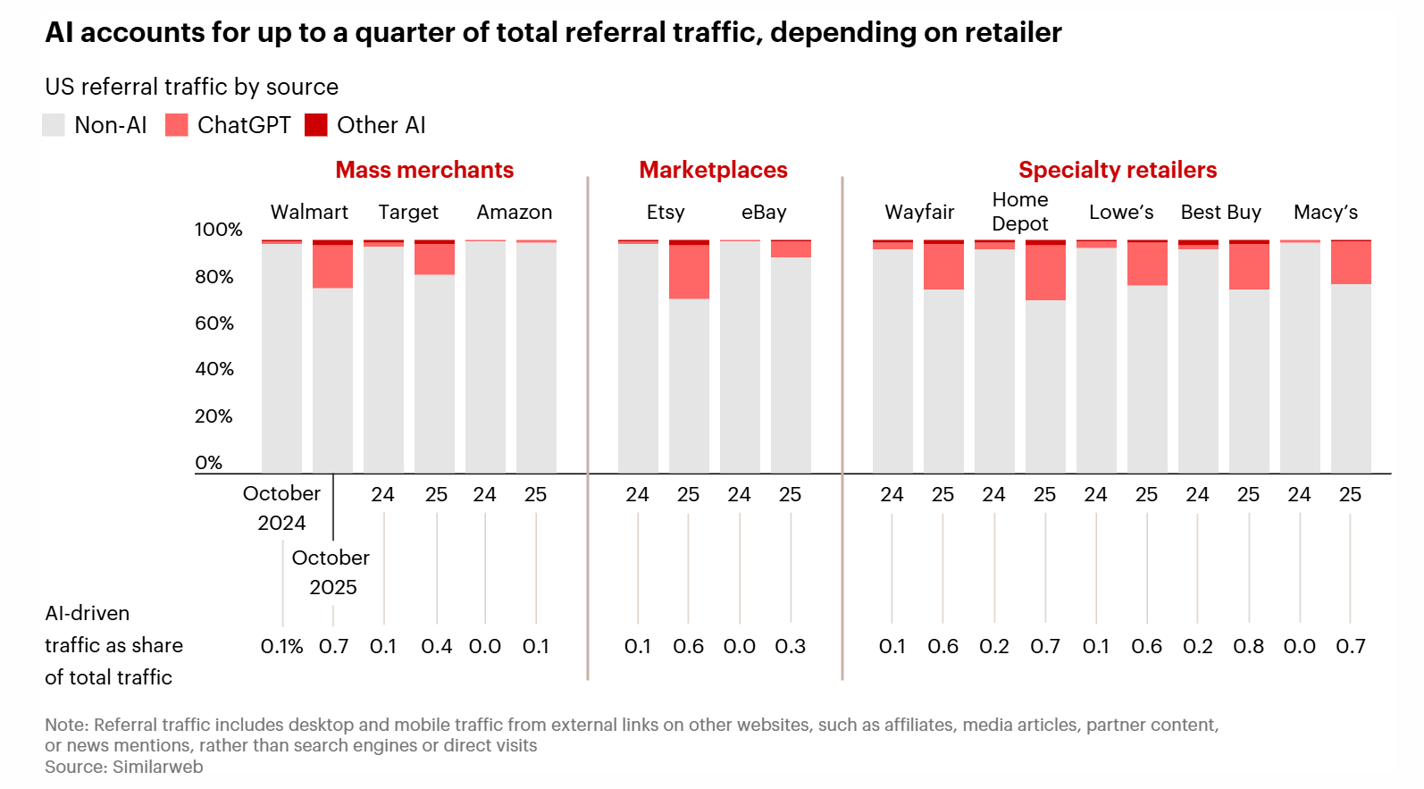 I should, however, note that even though AI (well, mostly ChatGPT for now) accounts for nearly quarter of total referral traffic for mass merchants, marketplaces, and specialty retailers in the US, AI-driven traffic as a percentage of total traffic is largely well below 1% today! So, if conversational continues to take off, it’s likely very, very early days here.