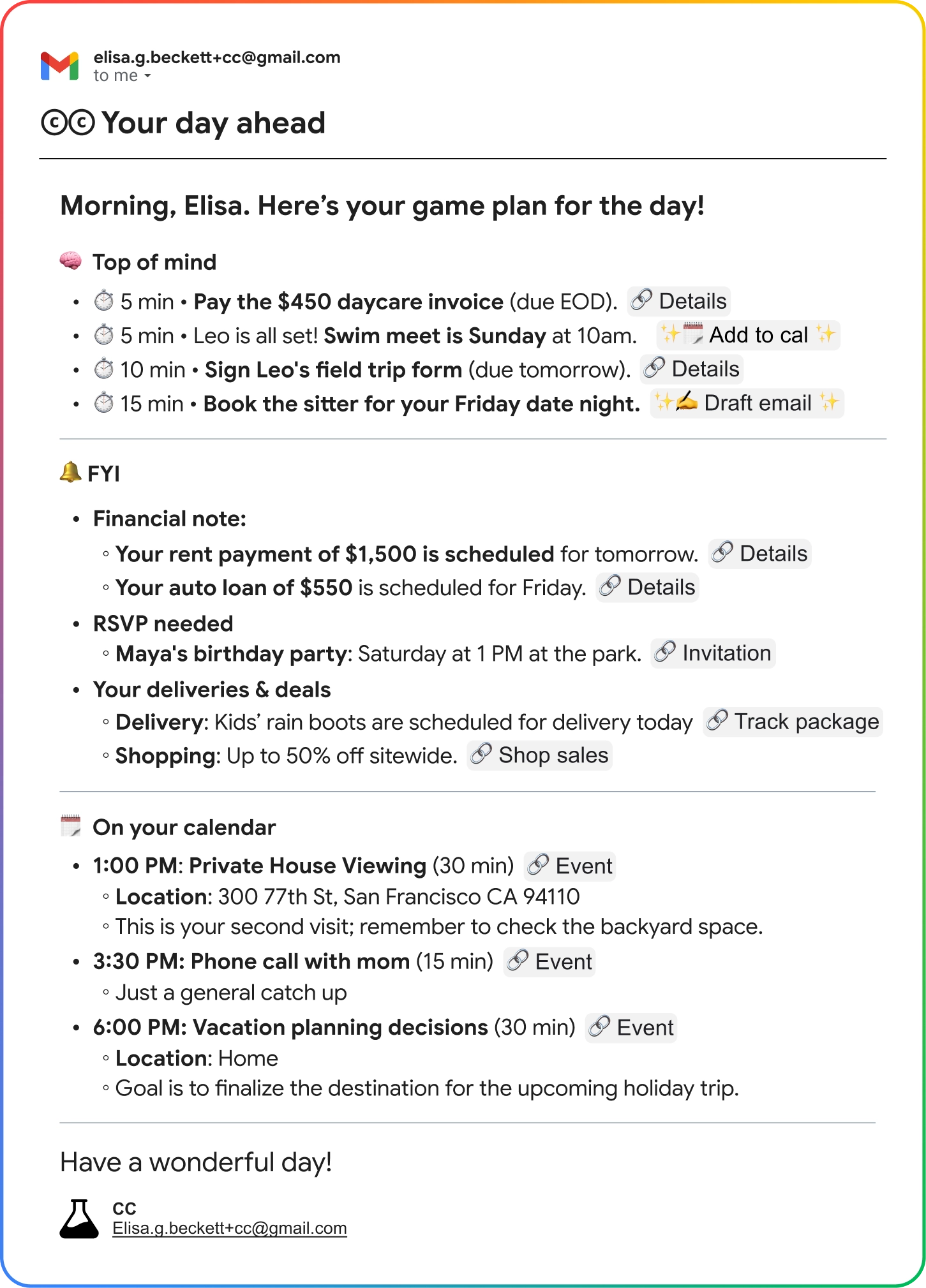 Contrast this with Google who has an entire ecosystem of products to know you better which will likely come pretty handy as they let AI features gather more context and data across the ecosystem to create a holistic picture of its users. Take Google’s new feature called “CC” in Gmail. Google hasn’t released this feature for the wider public yet, but you can join the waitlist. I signed up for this last week, and basically what “CC” does is it goes through all my emails/calendar everyday and then send me one email in the morning that I should pay attention to. On the very first day, it reminded me to update the payroll for the nanny we recently hired for our son. Even if I stop using Google search tomorrow, Google will still have a lot of these handy contexts to make its products more useful for me. I’m not sharing my personal email’s screenshot, but here’s one from Google: