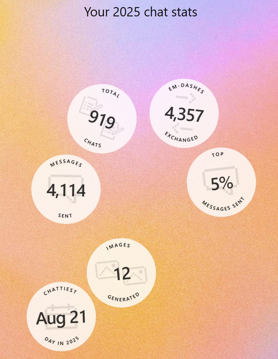 I think ChatGPT has such a great product market fit (PMF) for investment, and tech folks that I suspect ~50% of people working in analyst roles or people who needs to code a lot are likely in the top 5% users of ChatGPT this year. In fact, when I shared my stats in a couple of investing group chats I am active in, it turns out everyone else is top 1% users! I will be surprised if my usage doesn’t increase next year; my usage (I think) has gradually increased over the course of 2025.