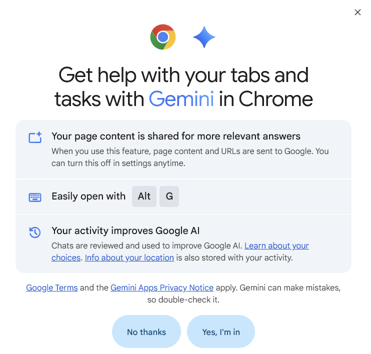 While clicking the Gemini’s diamond icon on top right on my Chrome browser yesterday to summarize a piece I was reading, Google asked me the following. Notice what it says: “when you use this feature, page content and URLs are sent to Google.” Even if I don’t use Google search/Gemini chat, Google will have a pretty clear understanding what I am reading and browsing across the internet.