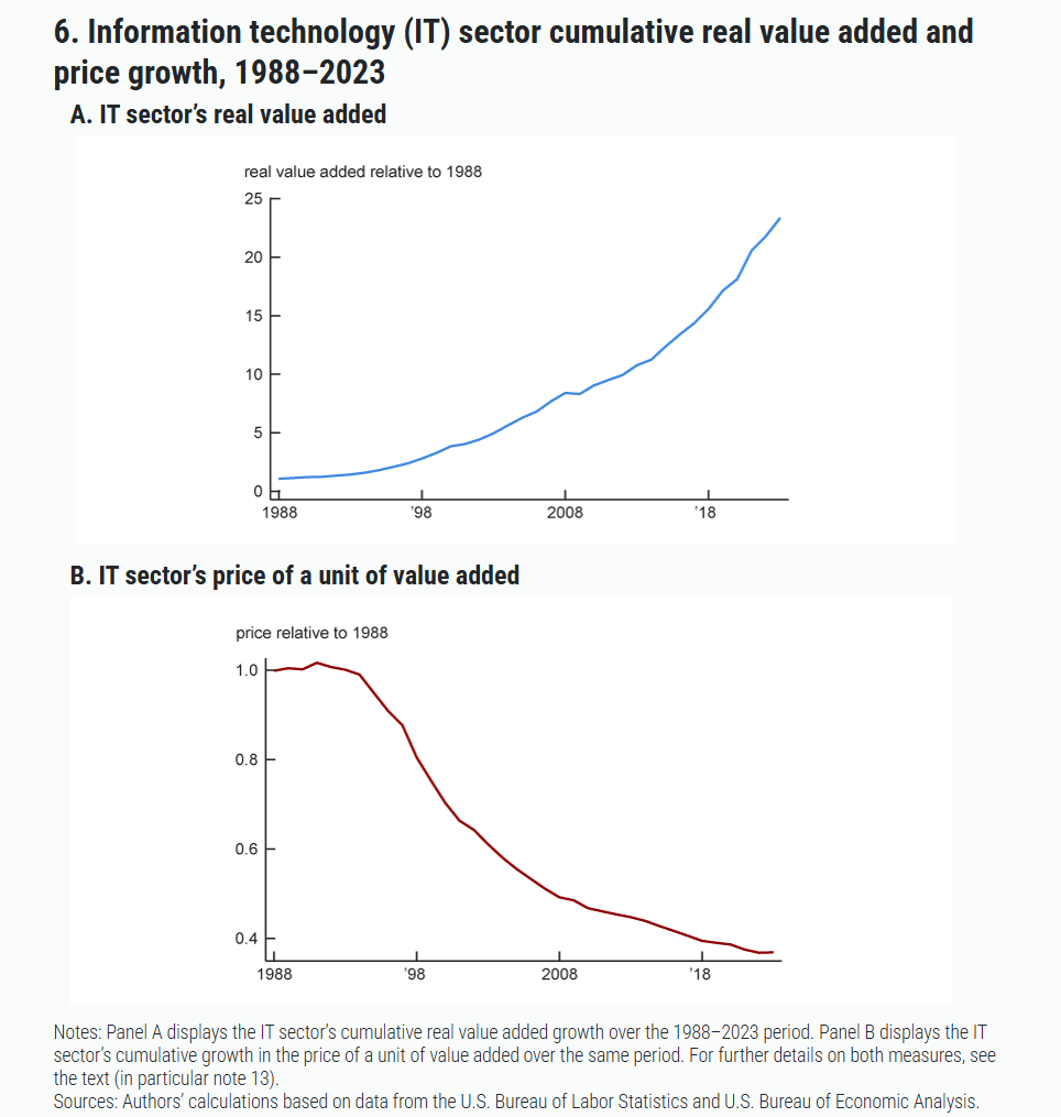 “Figure 6 shows why this approximate constancy over the longer run holds. In panel A, we plot the cumulative growth in real value added for the IT sector: In real terms, value added of the IT sector increased by over 2,300% between 1988 and 2023. In panel B, we plot the cumulative growth rate of the price of a unit of value added of the IT sector: This price declined by almost 70% over the 1988–2023 period. Putting these results together, along with the fact that aggregate nominal value added of the entire private business sector grew about 500% over the same period, leaves the share of the IT sector only slightly higher in 2023 than in the late 1980s.”