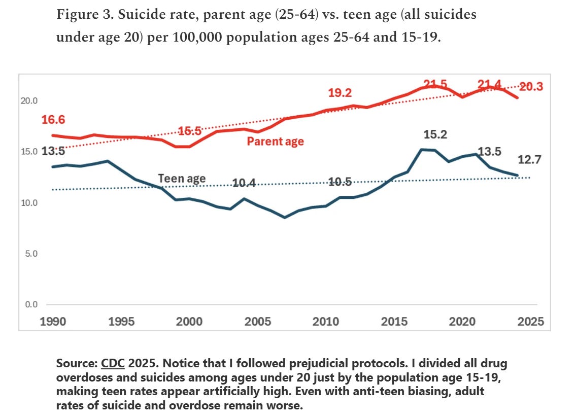 In the early 1990s, parent-age suicide rates were just 23% higher than teen rates, but by 2024 had risen to 60% higher. But because in Haidt’s, Twenge’s, and authorities’ fantasy, only teens commit suicide, never grownups, these crucial trends offering insights into real causes and prevention are being swept aside.”