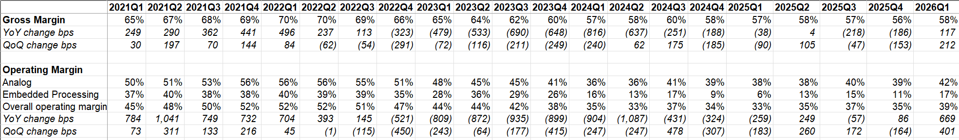 Given the revenue inflection, predictably margins have inflected as well. Gross margin increased to ~58% in 1Q’26 (+212 bps YoY), but still significantly below last cycle’s peak of ~70%. Similarly, operating margin expanded to ~39% (+669 bps YoY), but well below last cycle’s peak of ~52%. So, TXN should have a lots of headroom for further margin expansion if the cycle continues.