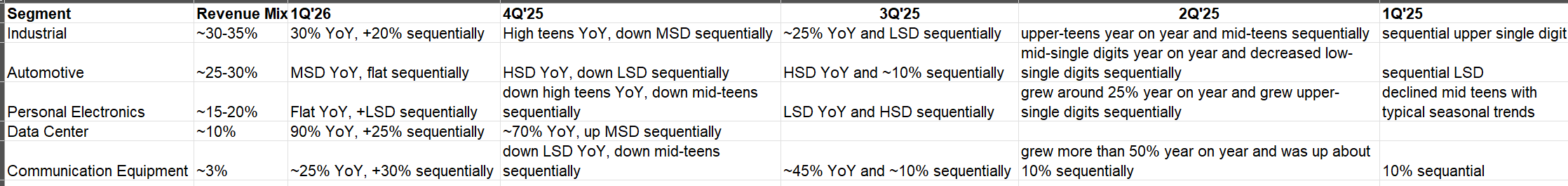 This growth was primarily led by industrials which was up 30% YoY and ~20% sequentially. Data center revenue was predictably also up ~90% YoY.