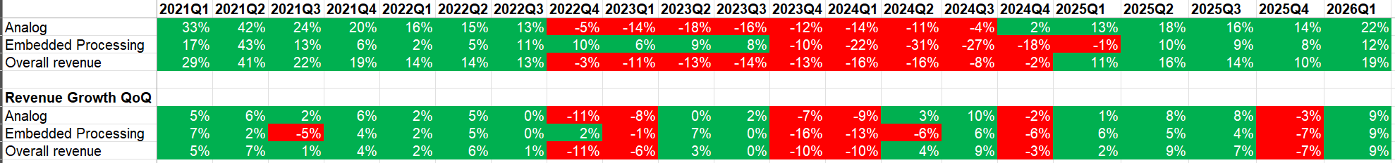 Self-deprecating jokes aside, Texas Instruments’ Q1 does seem to have reached an inflection point as analog revenue has exceeded 20% mark for the first time since 4Q’21.