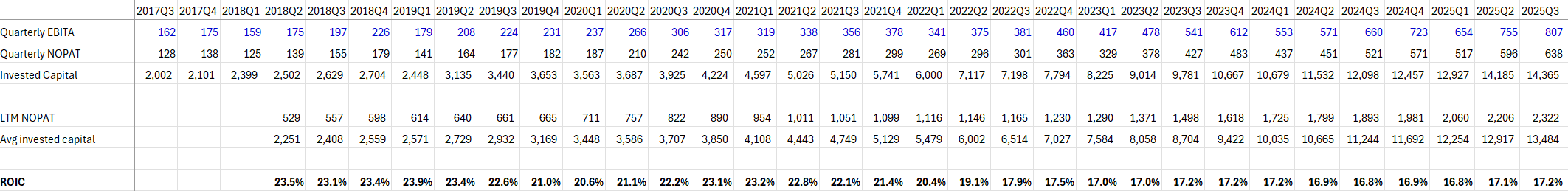Now, please notice that both my numerator and denominator in ROIC calculation takes CSU’s consolidated numbers, but as mentioned earlier, CSU does have non-controlling interest in Topicus and Lumine. So, you can fine tune this approach further by deducting the impact of Topicus and Lumine. I did some back of the envelope math for the current quarter, and it’s close enough to the consolidated number that I decided not to go through the brain damage on calculating “core” CSU’s LTM ROIC in each of the last ~60-70 quarters. Ultimately, what I wanted to see is a time series data on how ROIC is evolving and with the consolidated number, while not perfect, you can get much closer to the truth.