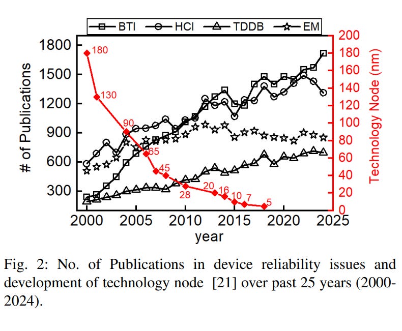 ICs have been widely adopted across various sectors and play a vital role in modern electronics. However, they face significant reliability challenges in nearly all of the application domains. These challenges are exacerbated by the increasing replacement costs of ICs at advanced technology nodes and the demand for uninterrupted operation, such as during the training of AI models. Aging remains a major threat to the lifetime of IC chips, arising from a combination of device degradation mechanisms, including Bias Temperature Instability (BTI), Hot Carrier Injection (HCI), and Time-Dependent Dielectric Breakdown (TDDB), which affect transistors, as well as electromigration (EM) in on-chip metal interconnects. The confluence of these effects leads to degraded performance and shortened lifespan. The need to understand and address these aging effects has grown significantly. Figure 2 shows the number of publications addressing each aging mechanism over the past 25 years…The data illustrate that interest in these issues has been steadily increasing, particularly in advanced technology nodes below the 10 nm regime.